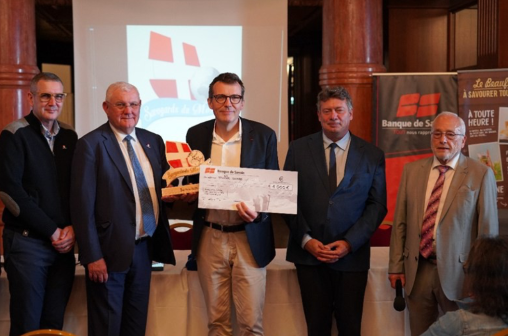 C’est Jean-Luc Combaz, Grand Maitre de la Confrérie de la fondue savoyarde représentant Pierre Poccard, Président de l’UPB et Renaud Beretti, maire d’Aix-les-Bains et président de Grand Lac qui remettent ce prix à Richard Bal (de Thonon-les-Bains), expatrié à Madrid, Espagne représenté par M. René Peyrolo.